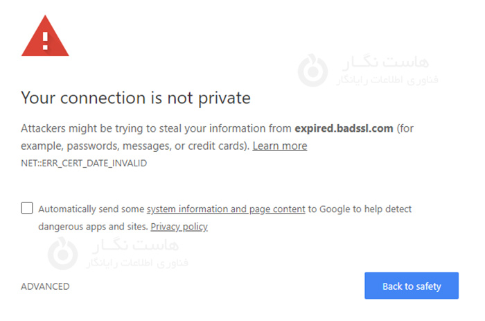 معمولاً این یک خطای ERR_CERT_DATE_INVALID ایجاد می کند. در کروم، ممکن است به شکل زیر باشد: