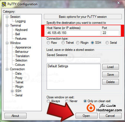 نرم افزار را باز کنید. آدرس آی پی را در کادر Host Name or IP Address و پورت اتصال به SSH بطور پیشفرض پورت 22 می باشد را در کادر Port وارد نموده و با کلیک بر روی open وارد قسمت ترمینال نرم افزار شوید.