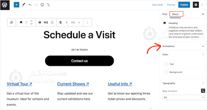 "انیمیشن ها" افکت های کوتاهی هستند که یک بار هنگام بارگیری صفحه پخش می شوند. برای افزودن این نوع انیمیشن به وبلاگ وردپرس خود، کافیست روی منوی کشویی کنار «انیمیشن» کلیک کنید.