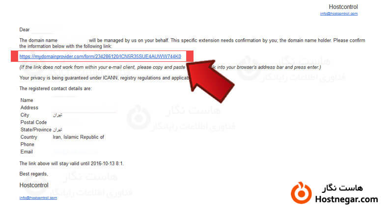 پس از ثبت دامنه یک ایمیل مشابه ایمیل زیر از سمت Hostcontrol برای شما ارسال می شود که ابتدا بر روی لینک موجود در ایمیل خود کلیک نمایید.