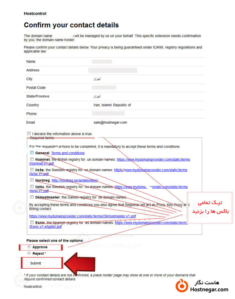 پس از کلیک بر روی لینک موجود درایمیل در صفحه ای که باز می شود تیک گزینه های مشخص شده را بزنید و در پایان بر روی دکمه ی Submit کلیک نمایید.
