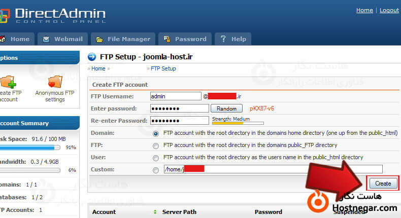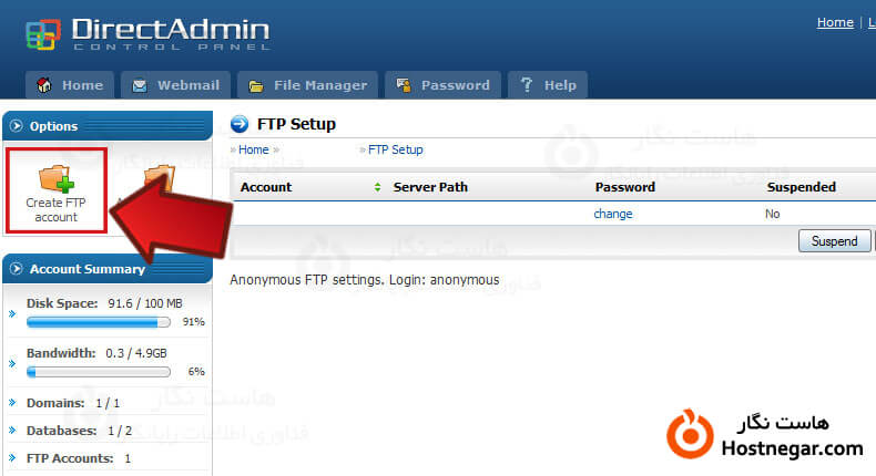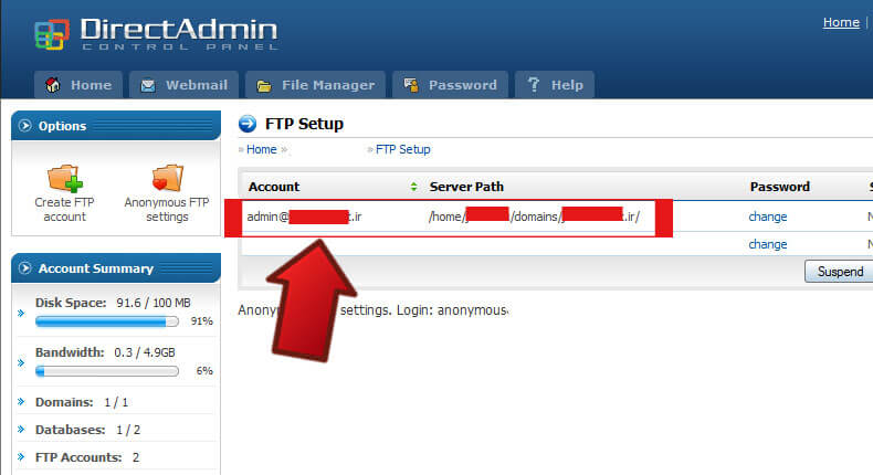 براي ايجاد اکانت اف تي پي در کنترل پنل دايرکت ادمين پس از ورود به صفحه اصلي هاست ایران در قسمت Domain Management گزينهFTP Management را انتخاب نماييد .