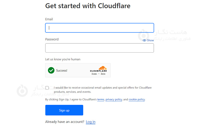 جهت فعال سازی CloudFlare ابتدا با کلیک بر روی این لینک وارد سایت www.cloudflare.com شوید . برای انجام تنظیمات باید در سایت عضو شوید برای عضویت در منوی بالایی سایت روی گزینه Sign up کلیک کنید. سپس وارد صفحه زیر میشوید: