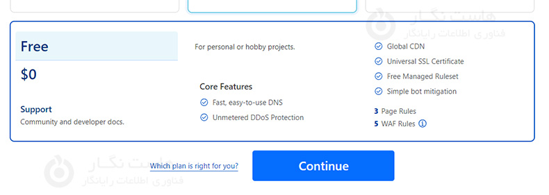 حال در مرحله Select your plan یا انتخاب پلن موردنظر شما قرار دارید، اکنون اولین پلن یعنی Free را انتخاب کنید و سپس روی دکمه Continue کلیک کنید.