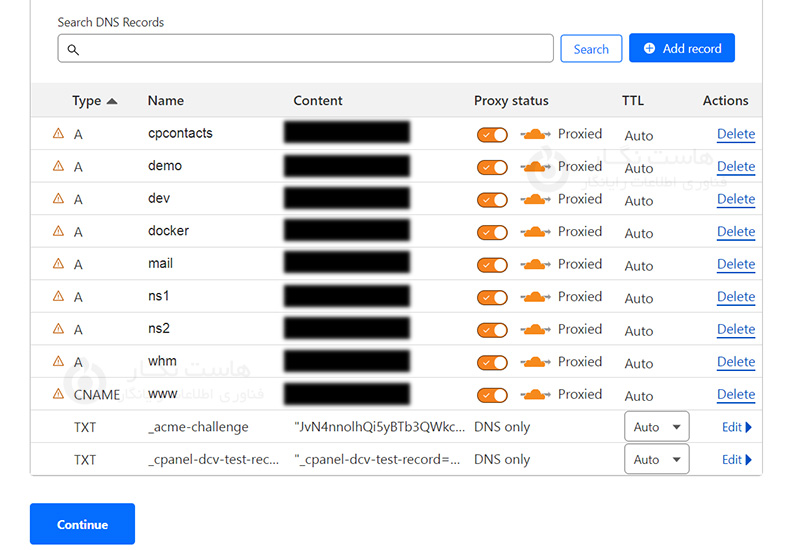 بعد از آنالیز ، رکورد های پیدا شده برای دامنه وارد شده توسط شما در لیستی به شما نمایش داده میشود ، لیستی از زیر دامنهها ، CNAME و MX فعلی تنظیم شده بر روی سایت شما نمایش داده میشود. CloudFlare دو زیر دامنه جدید برای دومین شما ساخته است که یکی از آنها با نام Direct برای هنگامی است که پس از اتصال این سرویس به سایت خود میخواهید به صورت مستقیم به سرورهای سایت دسترسی داشته باشید ( مانند نیاز به استفاده از CPanel ) و دیگری با نام FTP برای دسترسی مستقیم به پروتکل مربوط به آپلود فایلها بر رویهاست شما است که از آن میتوانید در برنامه های مربوط به این کار استفاده کنید. علامت ابر نارنجی رنگ به معنای روش بودن سیستم برای آن آدرس است ، پیشنهاد میشود برای تمامی آدرس ها با کلیک بر روی علامت ابر سیستم را برای آن آدرس نیز روش کنید . اگر نیاز به ایجاد رکورد جدیدی داشته باشید می توانید با کلیک بر روی Add Record رکورد مربوطه را اضافه نمایید. در انتها روی گزینه Continue کلیک کنید .