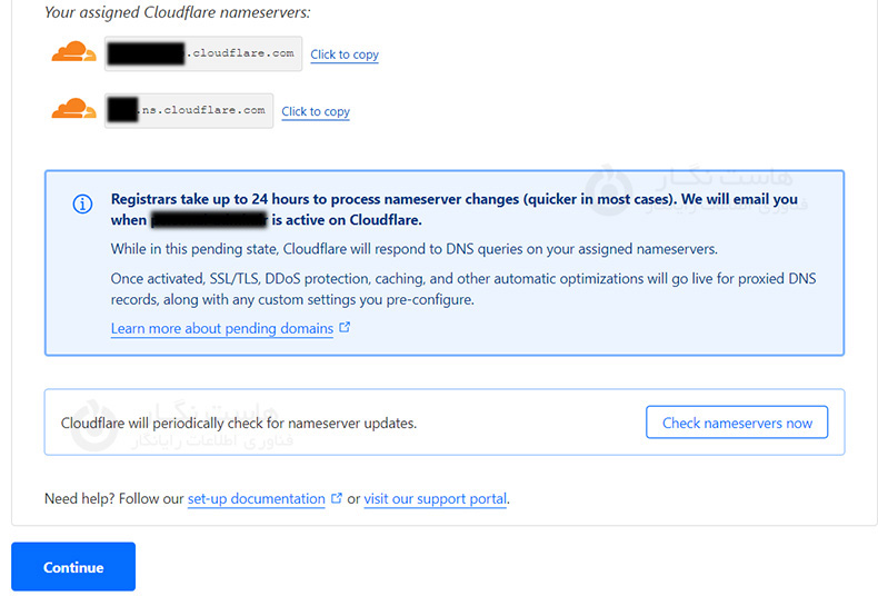 پس از تعویض DNS ها روی دکمه check nameservers کلیک کنید، تا متوجه شوید که آیا تغییر نیم سرور انجام شده است یا خیر. در صورتی که انجام شده بود Continue را کلیک نمایید و به مرحله بعد بروید.