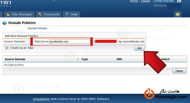 بعد از ورود به صفحه جدید در فیلد Source Domain نام کامل دامنه ای را که میخواهید روی دامنه اصلی سایت پارک شود را بنویسید و روی Add کلیک نمایید .