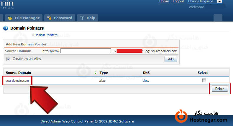 در صورتی که از پارک دامنه منصرف شده اید می توانید با کلیک روی گزینه Deleteدامنه را حذف نمایید
