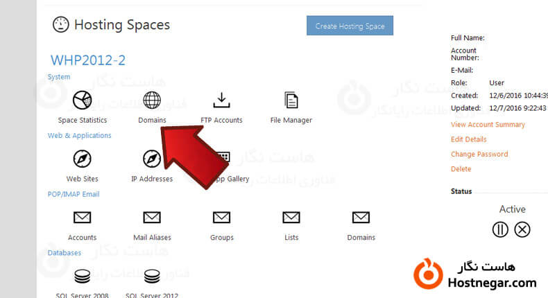 در ایتدا وارد پنل مدیریت هاست خود شوید و سپس در قسمتHosting Space در بخش system روی Domains کلیک نمایید.