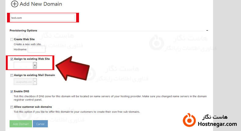 در صفحه ی جدید دامنه ی مورد نظر خود را در فیلد اول وارد کرده و در قسمت Provisioning Options تیک گزینه ی Assign to existing Web Site را زده و وب سایتی که قصد دارید دامنه را به آن متصل کنید را انتخاب نمایید.