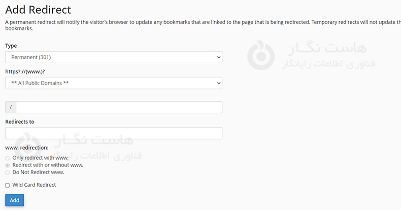 اگر میخواهید کاربر در عین هدایت شدن به مسیر جدید، آدرس درخواستی خود را از دست ندهد، کافی است گزینه ی Wild Card Redirect را فعال کنید. در این حالت اگر کاربر آدرس Domain.com/contact را وارد کند به آدرس Domain.ir/contact هدایت خواهد شد.