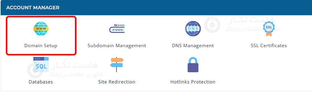 برای اضافه کردن دامنه جدید در هاست با پنل مدیریتی دایرکت ادمین وارد پنل شوید و در قسمت Account Management روی گزینه Domain Setup کلیک کنید .