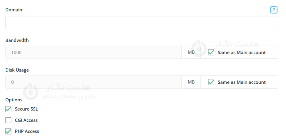 نکته : توجه داشته باشید که اگر گزینه Same فعال باشد به این اکانت ، مشابه اکانت دامنه اصلی هاست فضا و پهنای باند اختصاص می دهید.