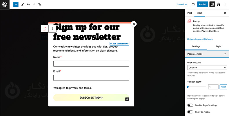 همانطور که گفتیم، به طور پیش فرض، وردپرس روشی برای ایجاد پاپ آپ ها ارائه نمیدهد. اگرچه لیست ویژگی های آن گسترده است، اما این گزینه را ندارد. با این حال، میتوانید از ابزار رایگانی مانند Otter Blocks استفاده کنید تا این قابلیت را بدست آورید: