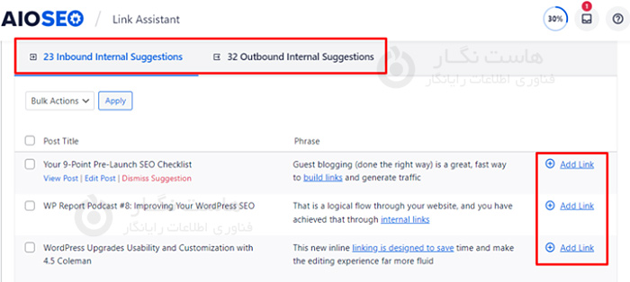 با استفاده از ویژگی link assistant در افزونه AIOSEO، می توانید لینک سازی داخلی وب سایت خود را بهبود بخشید. پیوندهای موجود را به شما نشان می دهد و همچنین فرصت های پیوند جدیدی را فراهم می کند. علاوه بر این، شما همچنین می توانید صفحاتی را که لینک داخلی ندارند برجسته کنید.