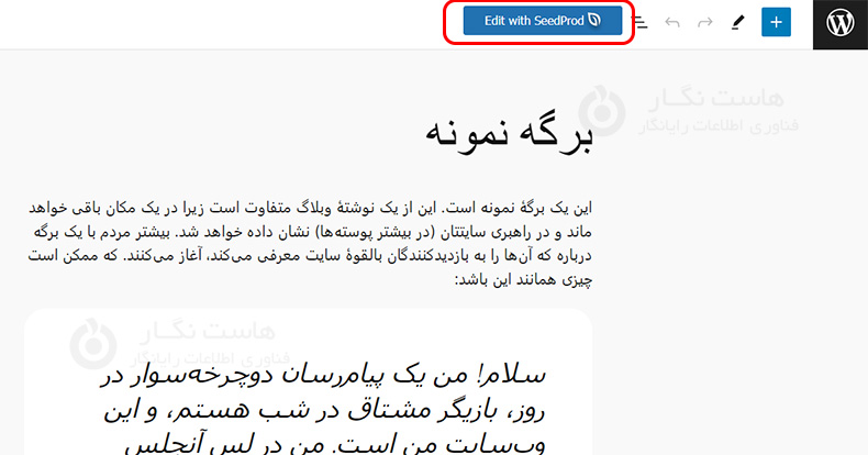 اگر این گزینه در انتهای همان قسمت ظاهر نمیشود، نگران نباشید. فقط به جای آن دکمه "ویرایش" را بزنید و در ویرایشگر بلاک، دکمه "ویرایش با SeedProd" را بزنید.