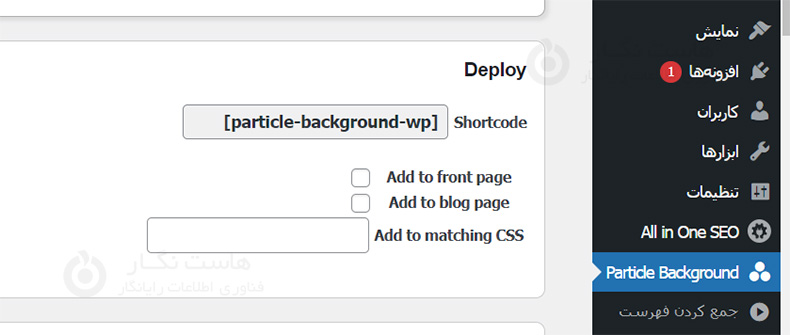 یکی از آنها Deploy است. این بخش شامل یک کد کوتاه آماده برای پسزمینه متحرک است، که در صورت خواستن میتوانید آن را بعداً به صفحات یا نوشتههای خود اضافه کنید. همچنین میتوانید تیک گزینه های Add to front page' و/یا Add to blog page' را بزنید تا به طور خودکار پسزمینه را در این صفحات درج کند.