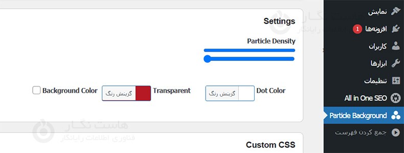 پایینتر تنظیمات پسزمینه انیمیشن وردپرس قرار دارد. شما میتوانید تراکم عناصر را تنظیم کنید که کنترل میکند چقدر نزدیک یا دور هستند، رنگ نقطه ذرات و رنگ پسزمینه. همچنین امکان دارد پسزمینه را شفاف کنید.