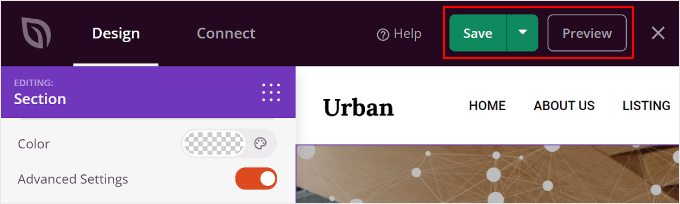 حال باید در داخل سازنده صفحهی SeedProd باشید. فقط ماوس خود را روی بخش صفحهای که میخواهید پسزمینه متحرک را در وردپرس اضافه کنید، حرکت دهید و آن را انتخاب کنید. بخشی را که انتخاب کردهاید، حاشیهی بنفش و نوار ابزار در بالای آن ظاهر شود. بعد از کلیک کردن بر روی بخش مورد نظر، حال نوار کناری در سمت چپ باید ظاهر شود. تنها کاری که الان باقی مانده این است که به تب " Advanced" بروید و تنظیمات " Enable Particle Background " را فعال کنید. چندین تنظیمات پسزمینه ذرهای وجود دارد.