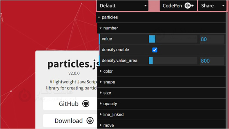 در این وبسایت، میتوانید طرح عناصر مورد نظر خود را، تعامل آنها و رنگ پسزمینه را سفارشی کنید. در تنظیمات "عناصر"، میتوانید تعداد، رنگ، شکل، اندازه، شفافیت، خطوطی که عناصر را به هم متصل میکنند و حرکت آن را تنظیم کنید.