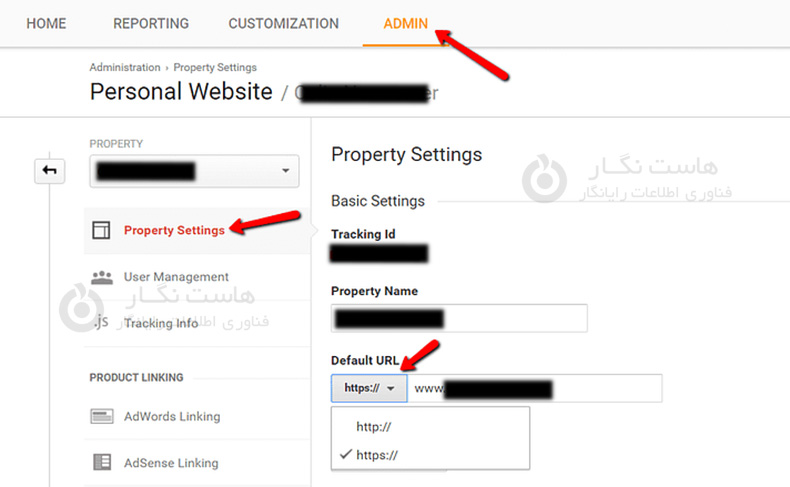 برای حفظ دقت در آمار خود، باید URL خود را در گوگل آنالیتیکس از HTTP به HTTPS تغییر دهید. برای انجام این کار، به مسیر Admin → Property Settings بروید. سپس، در زیر تنظیمات Default URL، از منوی کشویی http:// به https:// تغییر دهید: