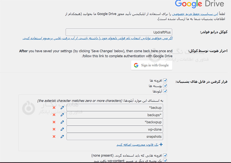 سپس، به بخش "قرار گرفتن در فایل های پشتیبانی " بروید. به طور پیش‌فرض، UpdraftPlus وب‌سایت را بطور کامل در برمیگیرد؛ با این حال، اگر بخواهید می‌توانید قانون استثنا را اضافه کنید. وقتی تنظیمات دلخواه خود را ست کردید، به پایین صفحه بروید و بر روی ذخیره تغییرات کلیک کنید.
