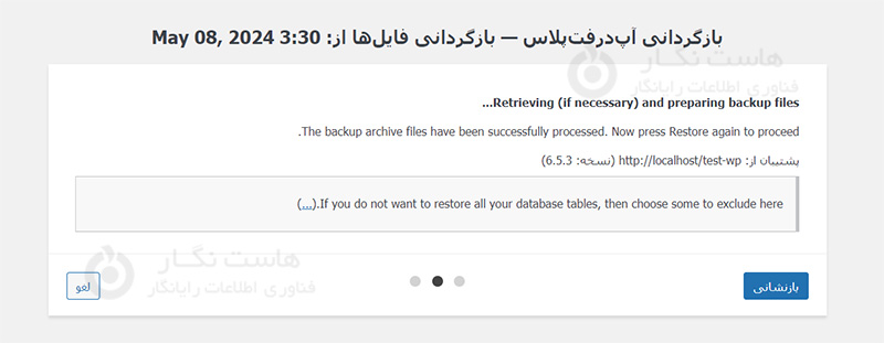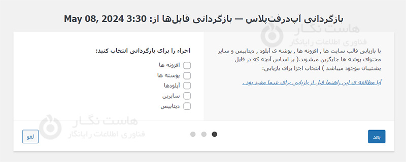 در این لحظه، فقط بکاپ مورد نظر خود را پیدا و روی بازیابی کلیک کنید. این مراحل عملیات بازیابی را شروع می‌کند. سپس باید انتخاب کنید که کدام بخش از وب‌سایت خود را بازیابی کنید: