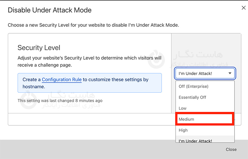 سپس سطح امنیتی که میخواهید به آن تغییر دهید را انتخاب کنید. حالت پیشفرض و معمولاً توصیه شده، حالت Medium است. وبسایت شما باید به وضعیت Active بازگردد و صفحه حفاظت DDoS غیرفعال خواهد شد.