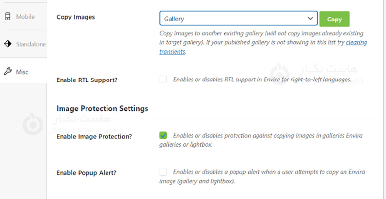 حالا یک گالری تصویر جدید با Envira Gallery ایجاد کنید. هنگام ایجاد گالری، بر روی تب "Misc" کلیک کرده و به پایین بروید تا تنظیمات حفاظت از تصویر را ببینید. شما گزینه " Enable Image Protection" را خواهید دید. تیک این گزینه را زده و گالری خود را ذخیره کنید