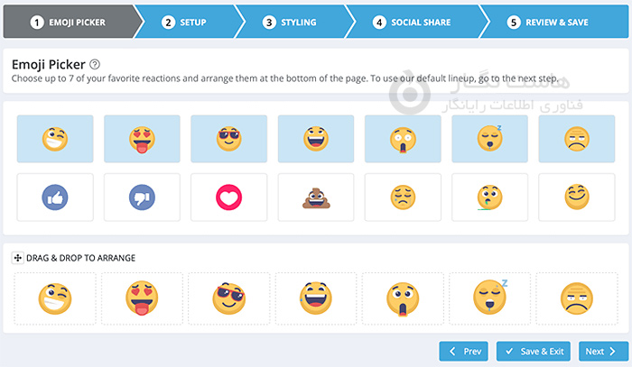 بخش 1. تنظیمات پیش فرض افزونه WP Reactions برای اکثر وب سایت های وردپرسی کار می کند. با این حال، هنوز راههای زیادی برای سفارشیسازی آنها بر اساس نیازهای شما وجود دارد. ابتدا 7 ایموجی پیش فرض را در پایین صفحه مشاهده خواهید کرد. میتوانید با کشیدن و رها کردن شکلکها، آنها را مرتب یا جایگزین کنید. هنگامی که یک ایموجی به رنگ آبی برجسته می شود، به این معنی است که از قبل گنجانده شده است.