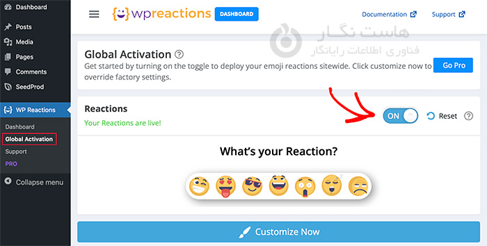 پس از فعال سازی، به WP Reactions » Global Activation بروید تا افزونه را پیکربندی یا کانفیگ کنید. پس از رسیدن به آنجا، باید گزینه "Reactions" را در موقعیت روشن قرار دهید.
