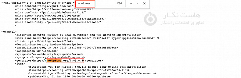 راه دیگری که از طریق آن یک هکر می تواند شماره نسخه شما را ببیند، مشاهده فید RSS شما است. هر کسی میتواند https://www.yourwebsite.com/feed/ جستجو کند و نتیجه را همانطور که در تصویر زیر نشان میدهد دریافت کند.