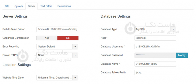 به تب Server بروید. در سمت راست بخشی به نام تنظیمات پایگاه داده است که جزئیات پایگاه داده جوملا در آن قرار دارد. به پیشوند میزبان، نام کاربری پایگاه داده، رمز عبور پایگاه داده، نام پایگاه داده و جداول پایگاه داده توجه داشته باشید.