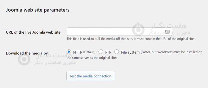 اکنون به قسمت پارامترهای وب سایت جوملا بروید. در اینجا، آدرس وب سایت جوملا موجود را وارد کنید و یکی از سه روش انتقال داده - HTTP، FTP یا File system را انتخاب کنید.