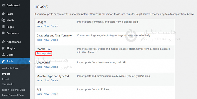 مرحله بعدی بازگشت به تب داشبورد وردپرس و شروع فرآیند انتقال است. ابتدا به Tools → Import بروید. با فعال شدن افزونه وردپرس، گزینه جوملا (FG) اکنون باید در دسترس باشد. Run Importer را انتخاب کنید.