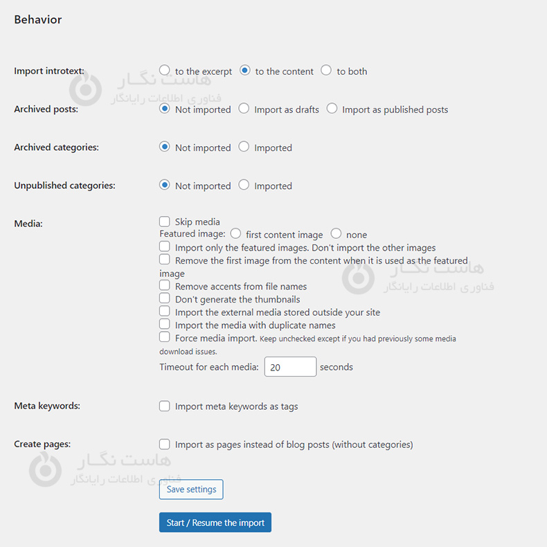 هنگامی که همه چیز از نظر شما درست بود، روی ذخیره تنظیمات و سپس Start / Resume the import کلیک کنید. مدت زمان انتقال جوملا به وردپرس به اندازه وب سایت بستگی دارد. مطمئن شوید که منتظر بمانید تا پیام IMPORT COMPLETED ظاهر شود و نوار پیشرفت روی 100٪ باشد.