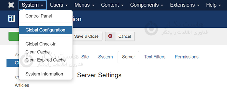 اکنون، ما می خواهیم پارامترهای پایگاه داده جوملا را پیدا کنیم. بدون آنها، CMS به افزونه FG Joomla to WordPress اجازه نمی دهد تا فرآیند import را راه اندازی کند. برای یافتن جزئیات پایگاه داده جوملا، وارد داشبورد جوملا شوید و روی سیستم در بالای منو کلیک کنید. Global Configuration را انتخاب کنید.