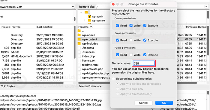 با این کار کادر محاوره ای مجوزهای فایل ظاهر می شود. حالا باید 755 را در قسمت مقدار عددی وارد کنید.