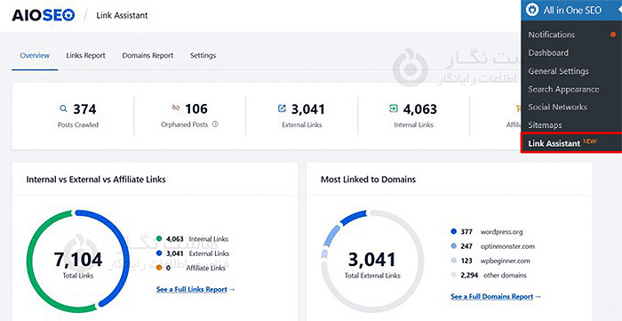 یک راه ساده تر برای انجام این کار استفاده از AIOSEO است. این افزونه ویژگی قدرتمند Link Assistant را ارائه می دهد که به شما کمک می کند تمام پیوندهای داخلی و خارجی سایت خود را مشاهده کنید.
