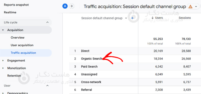 در Google Analytics 4، میتوانید به Reports » Acquisition » Traffic acquisition بروید و به ارقام جستجوی ارگانیک نگاه کنید.