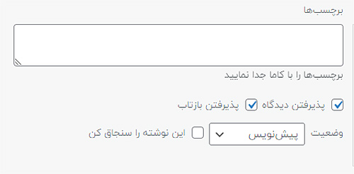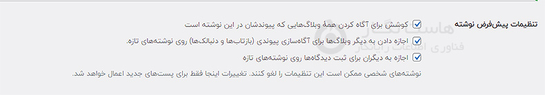 تیک گزینه "اجازه به دیگران برای ثبت دیدگاهها روی نوشتههای تازه" را بردارید. همچنین می توانید (اجازه دادن به دیگر وبلاگها برای آگاهسازی پیوندی (بازتابها و دنبالکها) روی نوشتههای تازه) را در اینجا غیرفعال کنید.(صفحات به طور پیش فرض غیرفعال هستند).