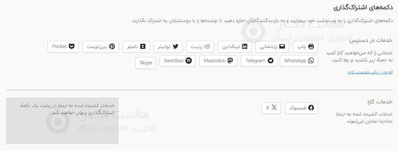 در زیر دکمههای اشتراکگذاری، سرویسهای مناسب برای وبسایت خود را به کادر «خدمات کارا» بکشید. همچنین گزینه پنهان کردن خدمات در پشت دکمه اشتراک گذاری عمومی وجود دارد.