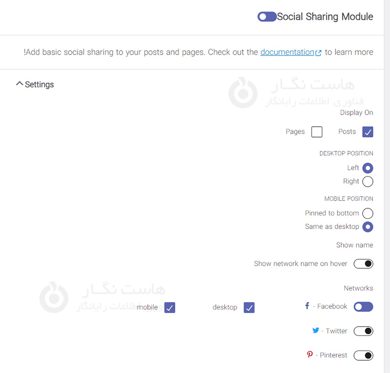 با فعال کردن این کلیک صفحه ای برای شما باز میشود که کافیست به به پایین اسکرول کنید و ماژول اشتراک گذاری اجتماعی را در زیر گزینه های ماژول های فعال پیدا خواهید کرد. در اینجا می توانید دکمه های اشتراک گذاری را پیکربندی کنید.