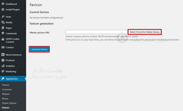 برای باز کردن رسانه وردپرس و انتخاب تصویری که می خواهید برای favicon خود استفاده کنید، روی "Select from the Media Library" کلیک کنید. اندازه تصویر باید حداقل 70x70 پیکسل باشد. با این حال، اندازه 260x260 یا بزرگتر توصیه می شود. پس از انتخاب تصویر، انتخاب خود را با دکمه "Generate favicon" تایید کنید.