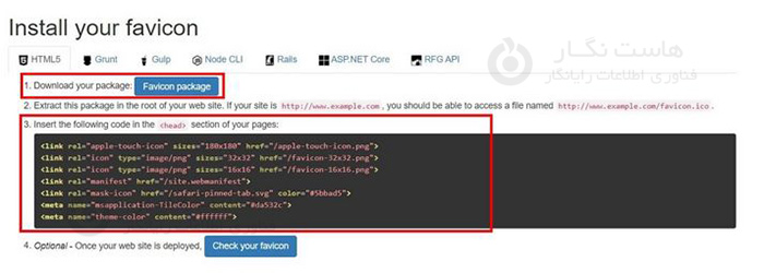 در مرحله بعد می توانید بسته favicon را دانلود کرده و کد HTML را کپی کنید. بسته را دانلود کنید و نام آن را "favicon.ico" بگذارید تا به عنوان favicon شناخته شود.