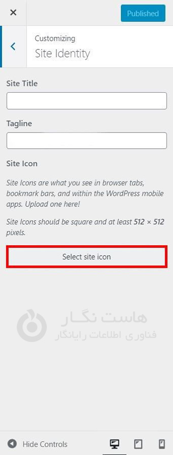در این قسمت می توانید عنوان وب سایت خود را تعیین کنید. این اطلاعات در کنار favicon در تب های مرورگر نمایش داده می شود. در قسمت "نماد سایت" روی "Select site icon" کلیک کنید تا favicon خود را در وردپرس تنظیم کنید.