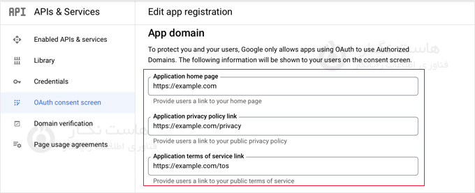 پس از انجام این کار، به بخش «Domain» بروید. در اینجا باید پیوندهایی را به صفحه اصلی وب سایت خود، صفحه privacy policy اضافه کنید.