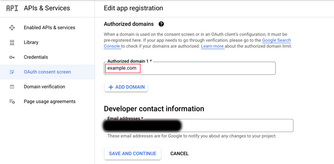 سپس باید روی دکمه «Add Domain» کلیک کنید تا نام دامنه وب سایت خود را اضافه کنید، مانند «example.com». اگر میخواهید ورود با Google را به بیش از یک وبسایت اضافه کنید، میتوانید روی دکمه «+ Add Domain» کلیک کنید تا دامنه دیگری اضافه کنید.