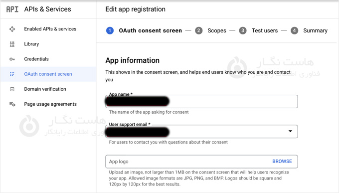 ابتدا باید نام کسب و کار خود را در قسمت نام اپلیکیشن وارد کنید. این مورد هنگام ورود به سیستم به کاربر نشان داده میشود، همچنین باید آدرس ایمیلی را که با آن وارد گوگل شده اید اضافه کنید.