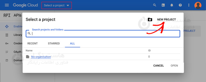 اکنون می توانید به وب سایت کنسول توسعه دهندگان گوگل مراجعه کنید. اگر قبلاً وارد نشده اید، از شما خواسته می شود با حساب Google خود وارد شوید. در مرحله بعد، باید از منوی بالا روی "Select a project" کلیک کنید. یک پنجره باز می شود که برای ادامه روی دکمه "New Project" کلیک کنید.